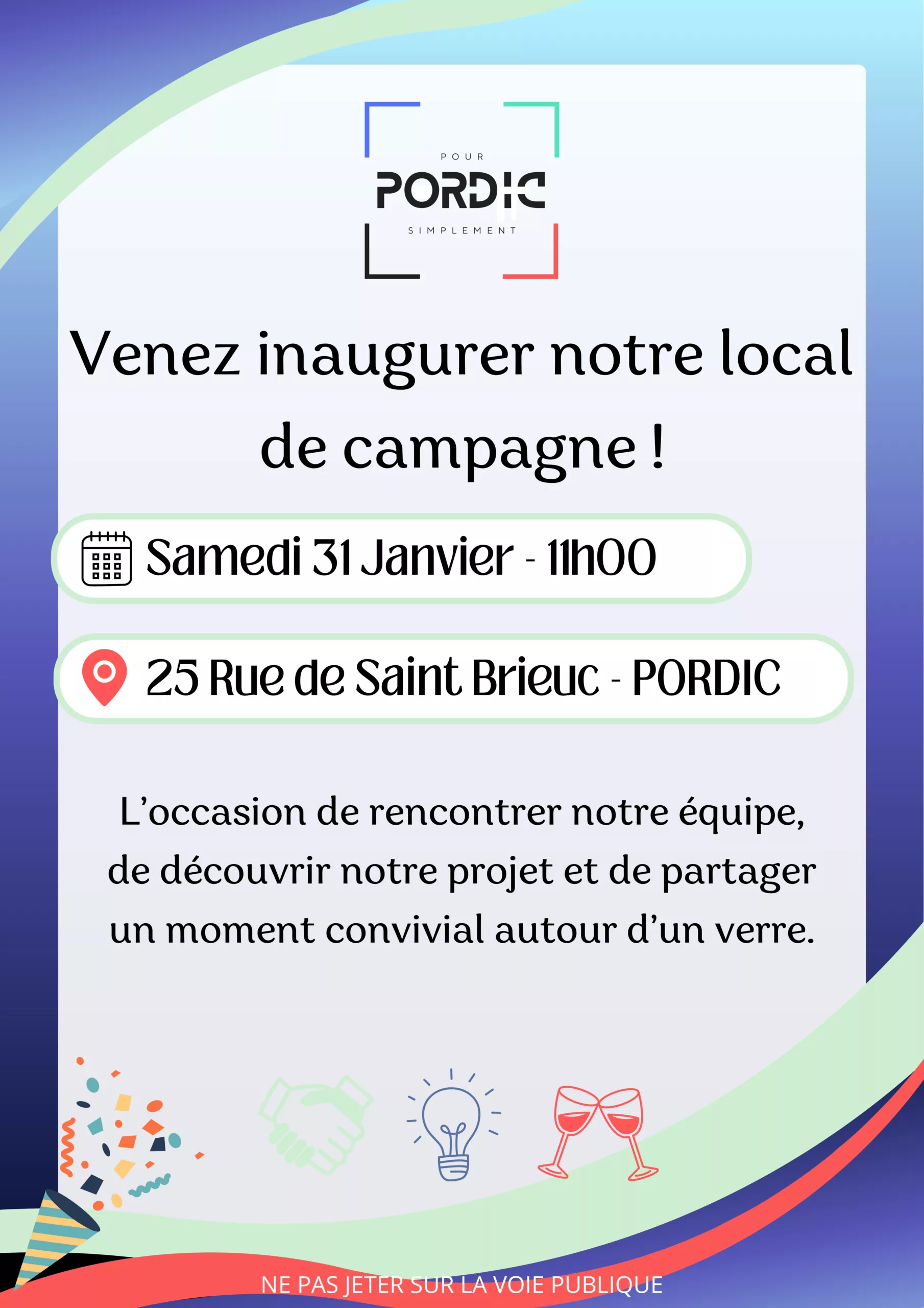 Local de campagne 25 rue de Saint-Brieuc, PORDICVous êtes invités à l'inauguration du local de campagne de la liste "Pour Pordic, simplement" menée par Gilbert MALLÉDANT : le samedi 31 janvier 2026 à partir de 11h 25, rue de Saint-Brieuc à Pordic Nous vous attendons nombreuses et nombreux !